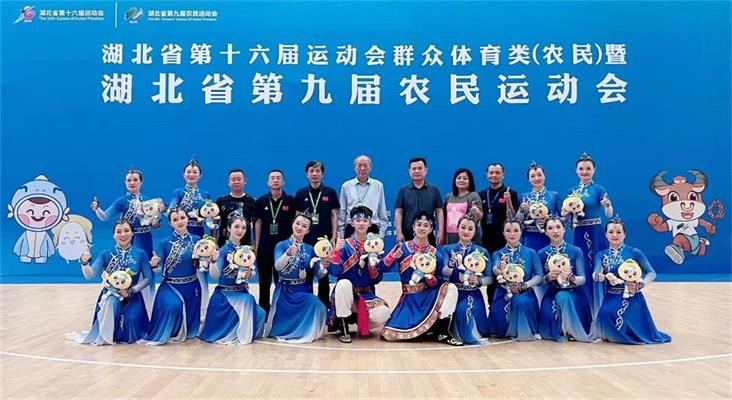 Congratulations to Ms. Xie Fang (The first row in the photo is the third lady from left to right)on winning one gold medal, four silver medals, and the top overall score in the mass (farmer) aerobics group competition at the 16th Hubei Provincial Games.